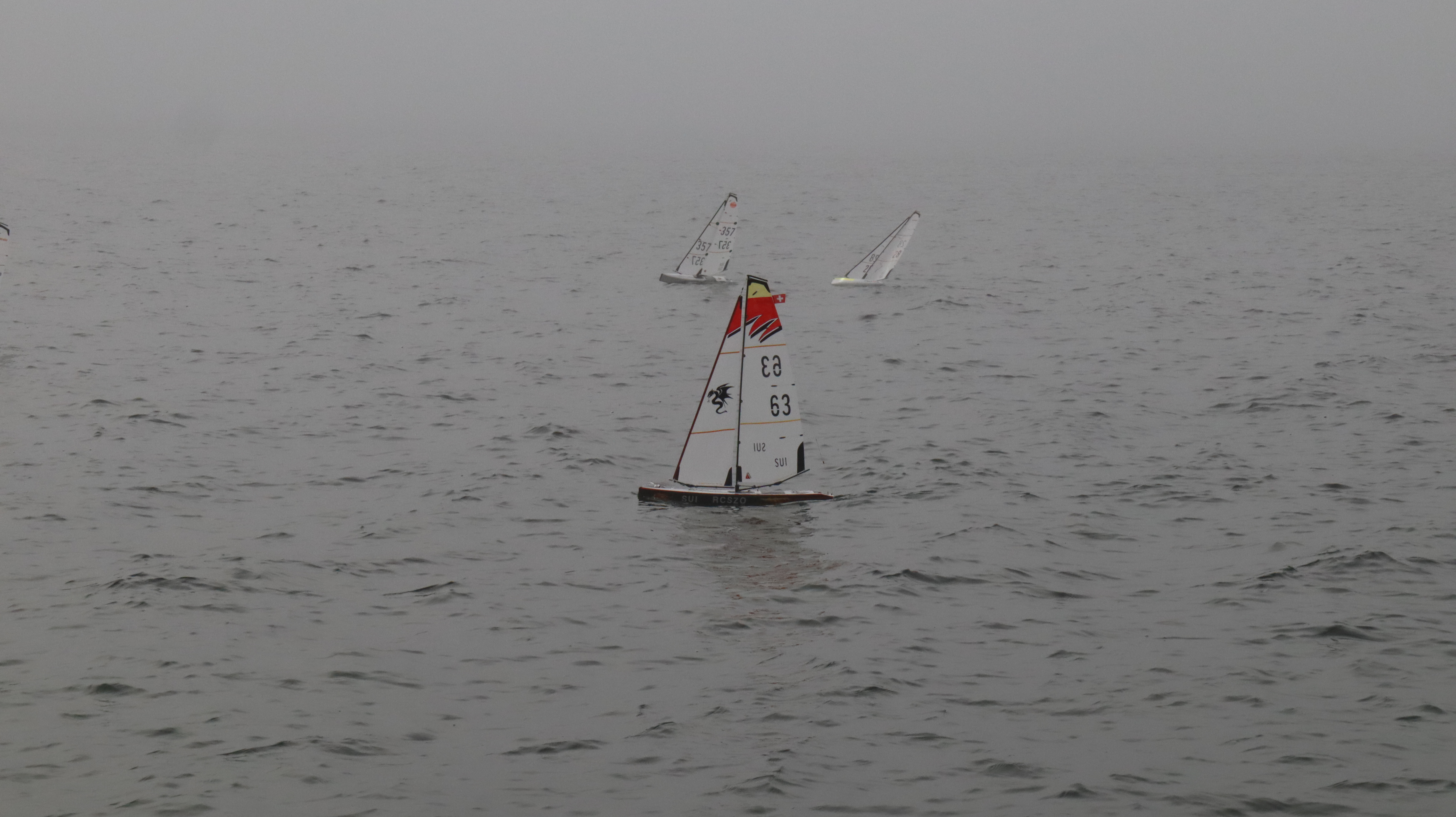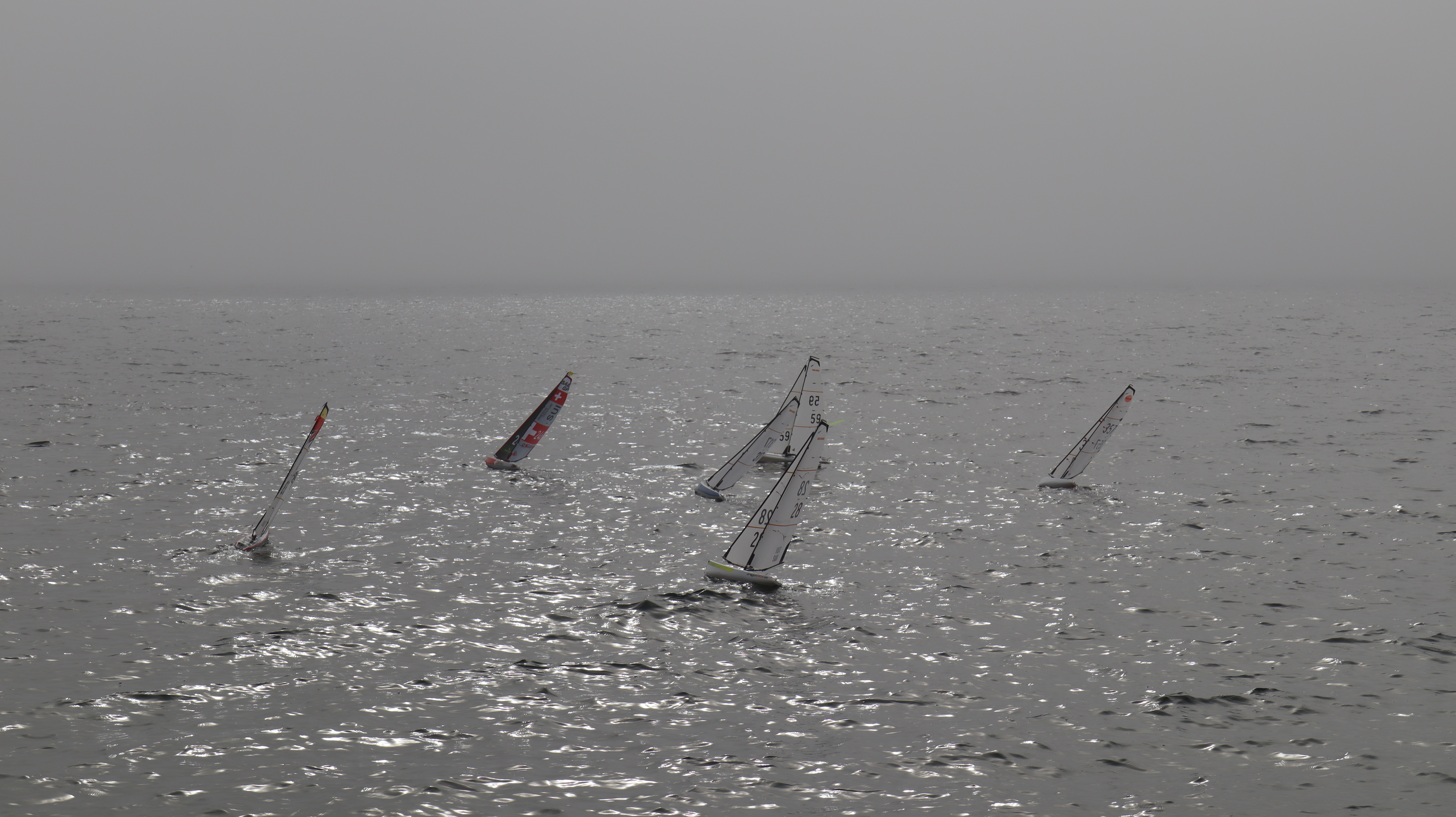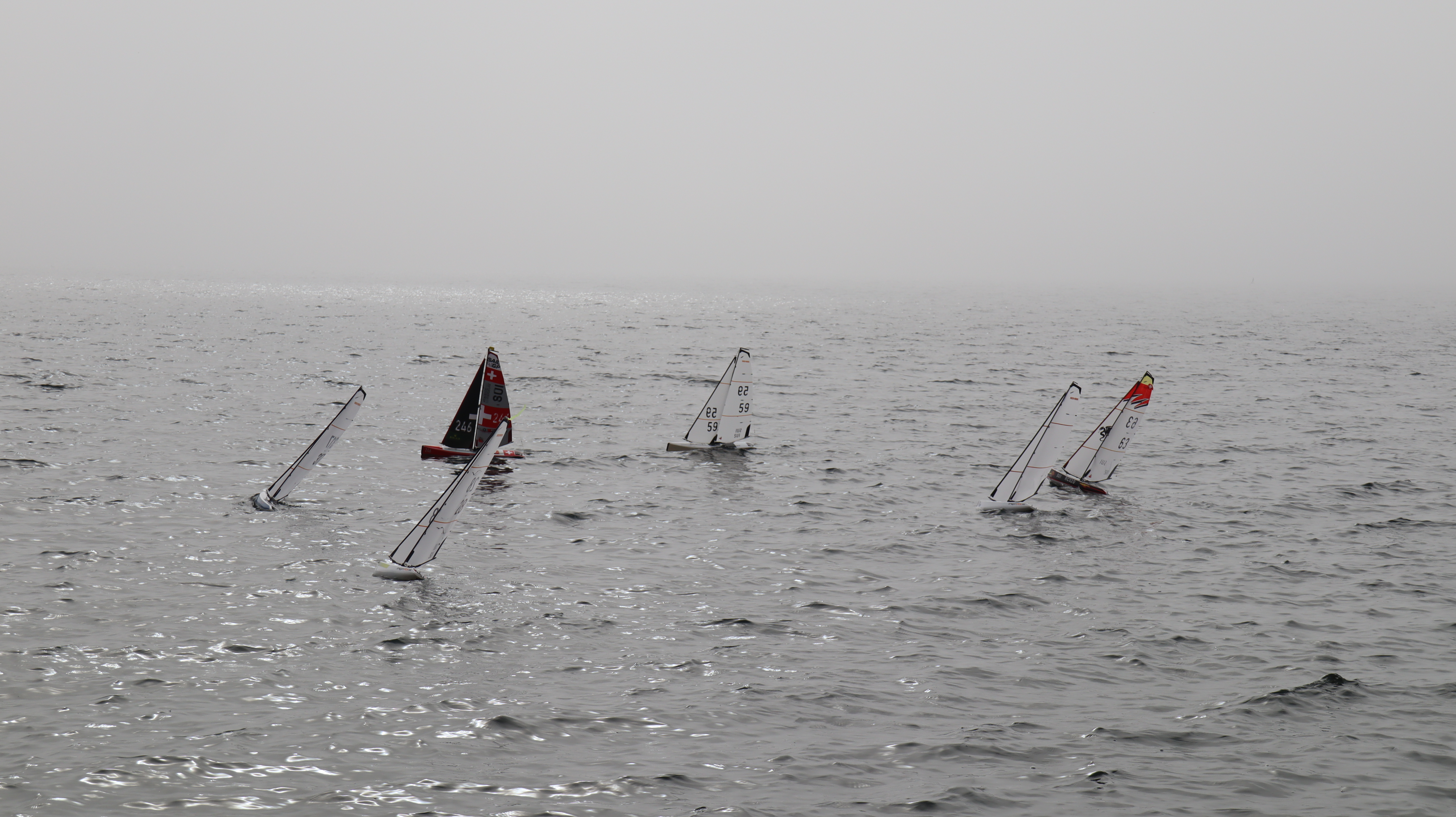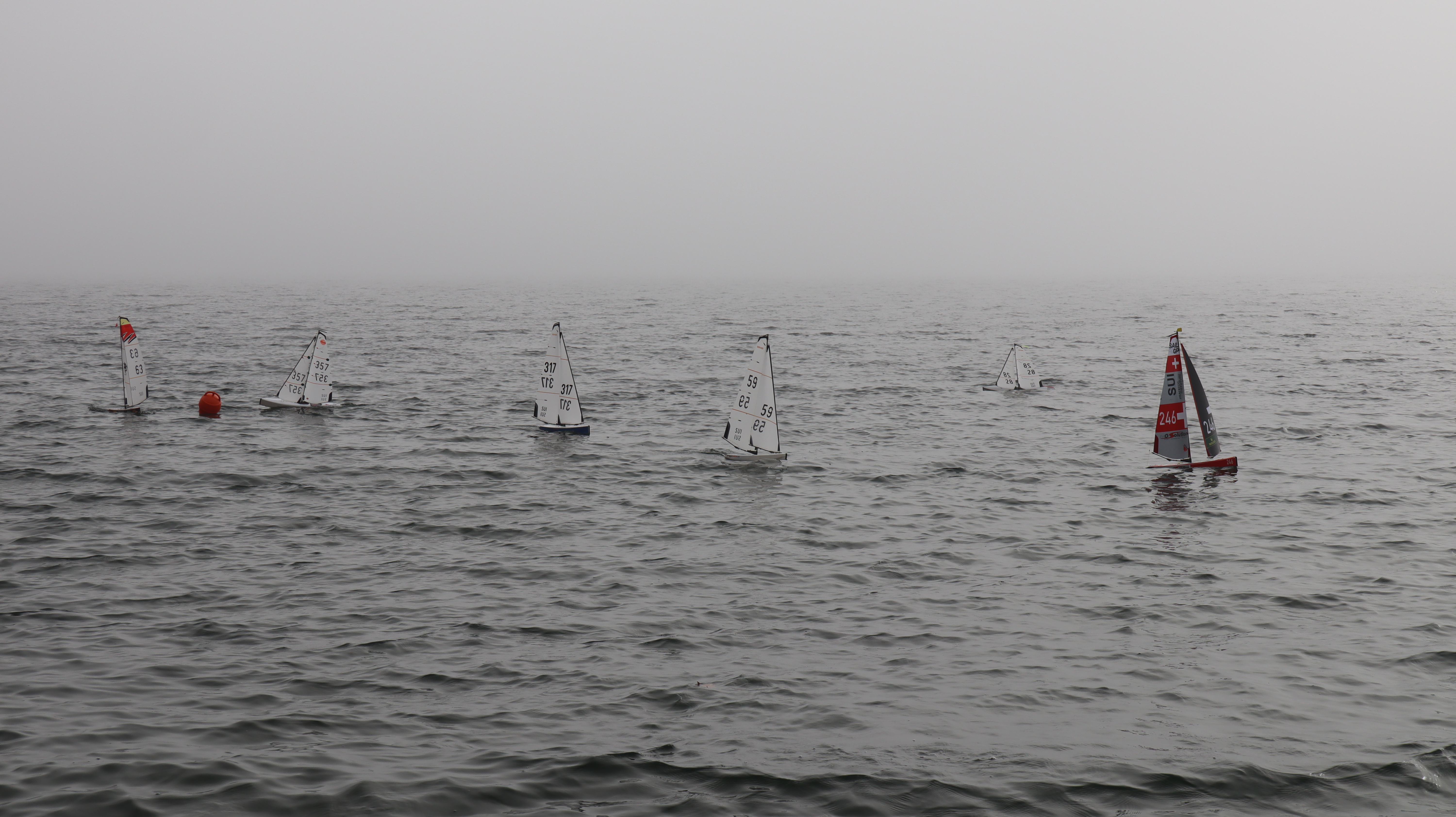 Bei Nebel und doch erstaunlich gutem Wind konnten wir etliche Starts an der ganz kurzen Startlinie üben. Es wurden unzählige Läufe gefahren. Ein wirklich cooler Trainingstag ohne Regen, aber saukalt. Inklusive Bootsrettung am Treppengeländer und Demofliegen eines F3K Wurfgliders.
